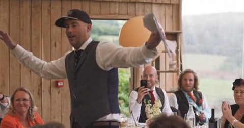 Tuore aviomies yllätti vaimonsa räppäämälle tälle heidän hääjuhlassaan. Humoristinen sulhanen Kit Evans muun muassa räppäsi vauvojen tekemisestä, ja hän sai myös hääjuhlan morsiusneidot mukaan hauskaan esiintymiseensä.