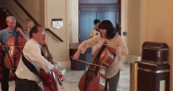 Kuuluisa ja maailmanlaajuisesti menestynyt sellisti Yo-Yo Ma irrotteli harjoitustauolla Chicagon sinfoniaorkesterin kanssa viime kesäkuussa. Soittajat pitivät rennosti hauskaa rakennuksen aulassa ohikulkijoiden ihastukseksi.