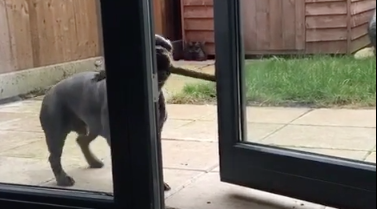 Suloinen pieni koira nimittäin yritti tuoda keppiä taloon sisälle takaoven kautta. Jude-niminen koira ei kuitenkaan vaikuta siltä, että hän luovuttaisi ihan helpolla keppinsä suhteen.